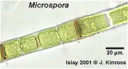 Microspora species are unbranched filaments, some at least having the capability in culture to attach to surfaces by a specialized basal cell, following zoospore germination. In field samples however they are almost always found entangled in mosses and liverworts and their original point of attachment is not discernible. Their distribution is therefore linked to those waters where mosses and liverworts are plentiful, and usually to quite humic waters.